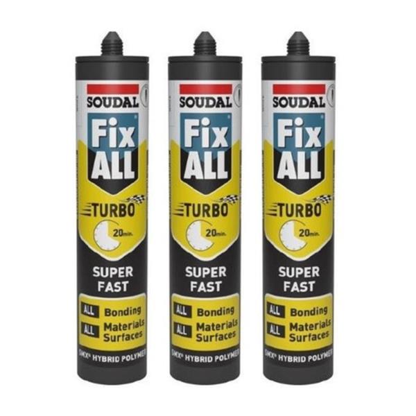Introducing the Soudal Fixall Turbo Super Fast Sealant/Adhesive Triple Promotion Pack, the ultimate solution for all your sealing and bonding needs. This versatile product is designed for both professionals and DIY enthusiasts, offering exceptional performance on a wide range of materials.