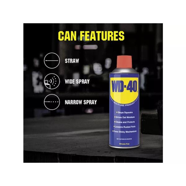 WD-40 Aerosol is a versatile product suitable for various tasks in your home, garage, or workshop. It effectively cleans grease and grime while also dissolving adhesives, making label and sticker removal hassle-free. Additionally, WD-40 provides protection for metal surfaces, guarding against moisture and corrosion, and serves as a lubricant for smooth operation of moving parts. When dealing with rusted or frozen metal components, WD-40's penetrating properties make them easier to remove. It also displaces moisture, making it a reliable choice for eliminating moisture-related short circuits in electrical systems (always remember to turn off the power before applying).
